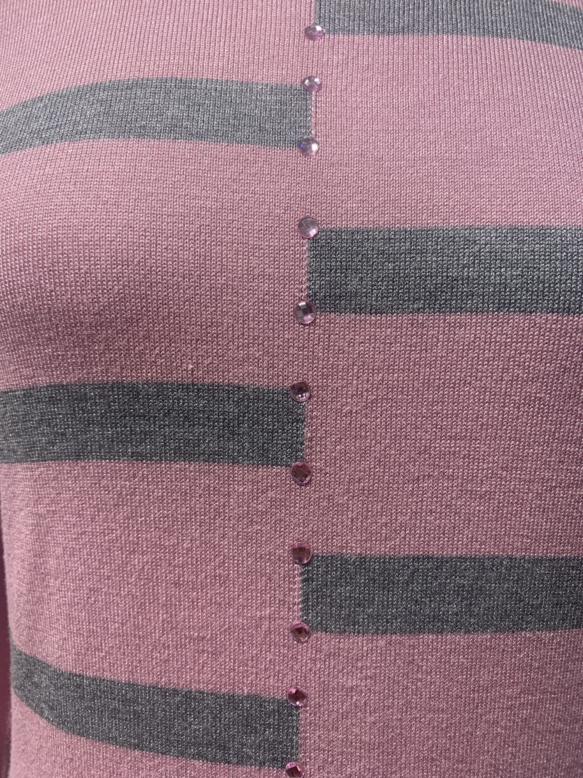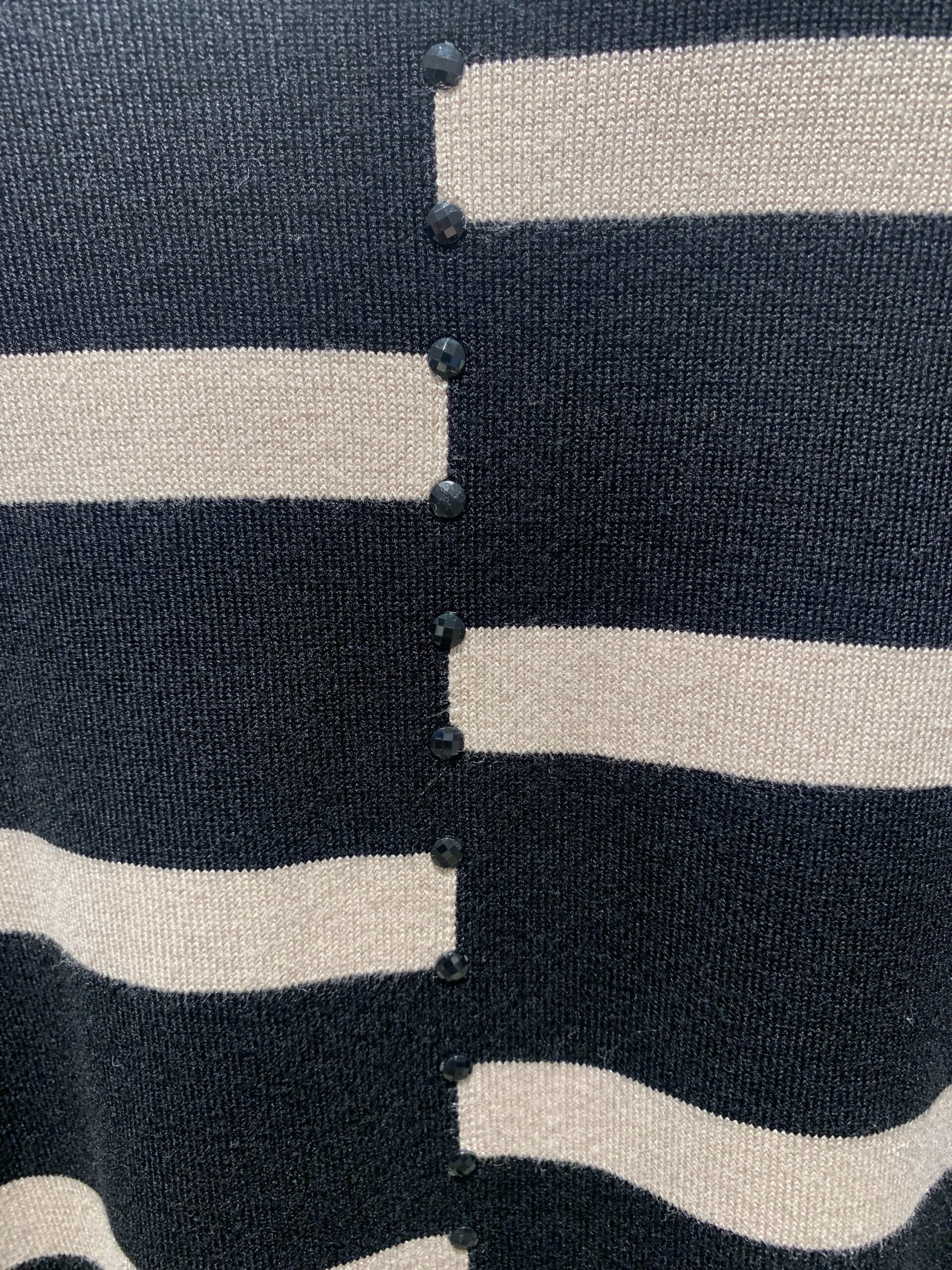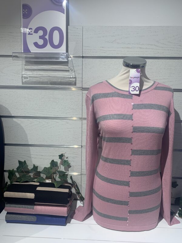 Elegant top by Paramour. Long sleeved round neck with vertical beaded detail. Two tone horizontal stripe on front with plain back. Durable viscose and nylon fabric. Three colours.