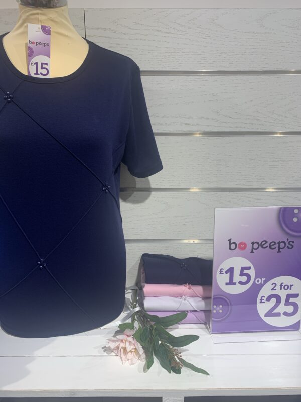 Lovely T-Shirt by Paramour. Subtle beaded detail in complementary colour. Polyester and cotton mix fabric. Offer – 2 £15 Ts for £25